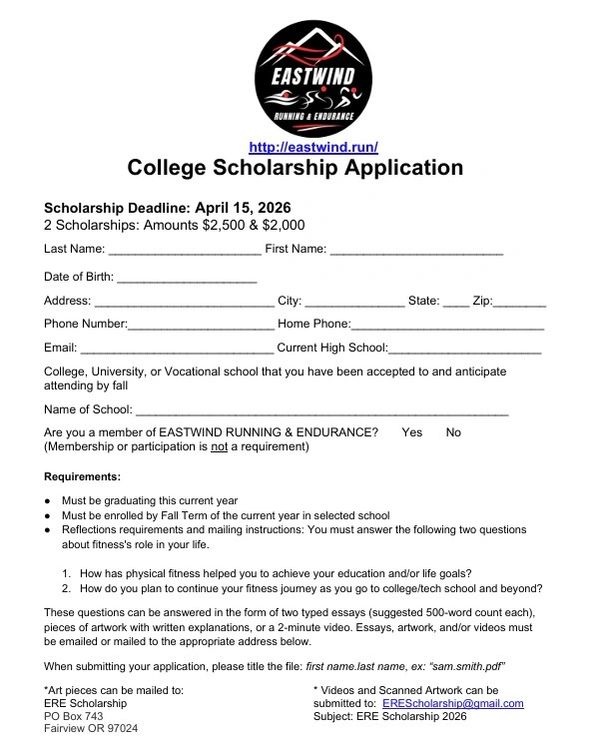 Eastwind Running & Endurance is proud to award college scholarships to local graduating seniors whose lives have been enriched by physical fitness. We urge students of all ability and experience levels to apply. Each person’s fitness journey is different. For some, it might be mentoring their teammates or shattering a personal record. For others, it could be taking control of one’s lifestyle for better personal health, or grueling physical therapy to recover from an accident.